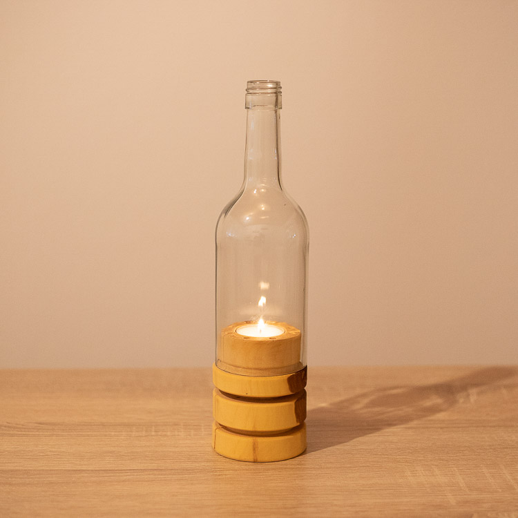 | Material | heimische Holzarten; Glasflasche; Teelicht |
