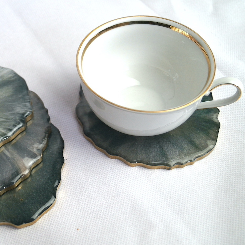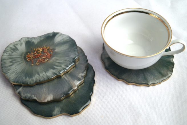 Diese einzigartig handgefertigte wellige Untersetzer aus Kunstharz mit Blattgoldelementen sorgen für besondere Deko-Akzente.